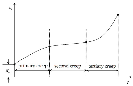 In mechanical strength, the creep of a structure is the permanent deformation of aeroengine turbine structures induced by high temperature load when the stress is less than yield strength [28]. Obviously, creep curve describes the variation of the strain ε of structural materials with time t, as explained in Figure 1.