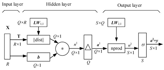 In Figure 2, X and T are the matrices of input samples and output samples, respectively; Q × R indicates the dimensions of matrix LW1,1, which is the weighted matrix in the hidden layer, where Q and R are the numbers of training samples and input parameters, respectively; ||dist|| denotes the Euclidean distance function; b is the threshold of Q neural cells in the hidden layer; n1 expresses the network vector of the hidden layer; △ indicates the transfer (Gauss) function; a1 is the output of the neuro cell; S × Q indicates the dimensions of the matrix LW2,1, which is the connection threshold value between the hidden layer and the output layer, where S is the number of output parameters; nprod is the weight function of the output layer; n2 indicates the network vector of output layer; Θ is the purelin transfer function of the output layer; y = a2 explains the outputs of the neuro cell in the output layer. The input layer transmits the sample X into the hidden layer, in which one nerve cell has one sample and there are Q nerve cells. In the process of transmission, the transfer function is a Gauss function with the matrix of weights and the threshold level vector b. The third layer is the output layer to which the information is transferred from the hidden layer with respect to the matrix of weights LW2,1. Herein, the weight function is the normalized dot product function denoted by nprod.