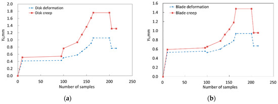 As illustrated in Figure 7, the creep seriously influences the BTRRC of aeroengine, and the BTRRC firstly decreases from start to cruise for the aeroengine. At t = 180 s, the BTRRC reaches its minimum and increases a bit when the aeroengine starts to cruise. Obviously, the dangerous point with respect to BTRRC occurs at t = 180 s, at which point gas temperature and rotational speech reach their maximum. The creep deformations of three objects at t = 180 s are shown in Figure 8.