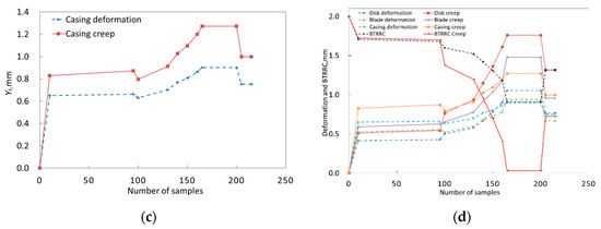 As revealed in Figure 8, at t = 180 s, the maximum creep deformations of the turbine disk, blade and casing were 1.765 mm, 1.4892 mm and 1.2716 mm. At that point in time, the maximum creep deformation of BTRRC is 1.9826 mm. Therefore, t = 180 s was selected as the computing point for BTRRC reliability analysis in this paper.