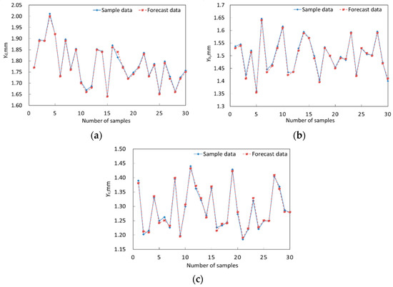 Along with the theory and concept of the DCGRENN method and BTRRC reliability analysis, in the GRENN model, the Gauss function is selected as the transfer function in the hidden layer, in which the weights matrix LW1,1 was computed using the Euclidean distance function [33,34,35]. Then the outputs of the hidden layer were regarded as the connected weights matrix LW2,1 of the hidden layer and the output layer. To avoid excessive modeling error, the data of the acquired samples were normalized. The normalized data were applied in order to train the DGRENN model by computing the parameters of DGRENN using the cross-validation method [31]. Finally, smooth factors of = 0.87, = 0.84 and = 0.76 were obtained, the weights matrix LW1,1 in the hidden layers of three objects (Yd, Yb and Yc), the weight matrix LW2,1 in the output layer, and the threshold matrix b, which are illustrated in Appendix A. By introducing the Appendix A, comprising three equations, into Equation (9), the DGRENN models were structured. The remaining 30 samples were employed to check the established DGRENN model. The prediction results are shown in Figure 9, and their root-mean-square errors (RMSEs) are listed in Table 3. It is revealed in Figure 9 and Table 3 that the predicted results are almost consistent with the original data due to small RMSE, indicating the effectiveness and accuracy of the presented DGRENN models.