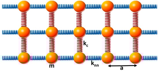 In Equations (1a)–(1c), and are the displacements of the mass of chain 1, 2, and 3, respectively. is the mass, and the viscous damping coefficient models the dissipation. is the stiffness of the springs in the waveguide chains. Here, we take the coupling constant between chains to be the same for all coupled chains. In the limit of long wavelength compared to the inter-mass spacing, , the equations of motions (1) of the three coupled linear harmonic chains of masses and springs become the following: