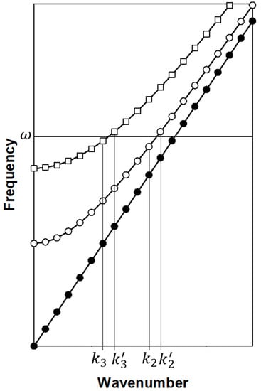 We now attempt to solve Equations (6a)–(6c) using multiple-time-scale perturbation theory []; the nonlinear term being the perturbation. For this, we consider to be a small quantity. The advantage of multiple-time-scale perturbation theory is that it can capture nonlinear amplitude–frequency interaction in systems with time-dependent amplitude and phase []. This is the case when multiple waves with comparable amplitudes interact with each other, leading to multiple secular terms in the dynamical equations. The additional degrees of freedom introduced via the multiple time scales are necessary to obtain a perturbation solution. While approaches such as the molecular dynamics method can also be utilized [] to numerically solve nonlinear dynamical problems, analytical methods are still useful tools to illuminate the multiple wave scattering processes in nonlinear one-dimensional mass-spring chains, such as the one studied here.