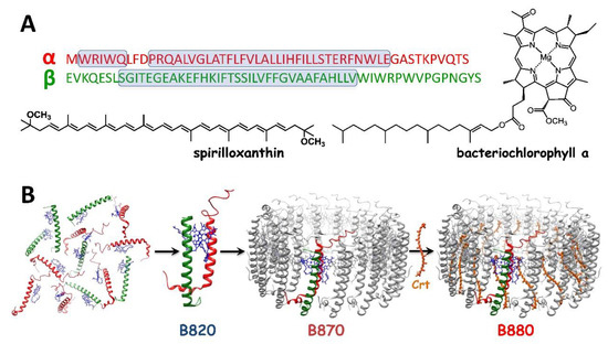 - Davis, C.M.; Bustamante, P.L.; Loach, P.A. Reconstitution of the bacterial core light-harvesting complexes of Rhodobacter sphaeroides and Rhodospirillum rubrum with isolated α- and β-polypeptides, bacteriochlorophyll a, and carotenoid. J. Biol. Chem. 1995, 270, 5793–5804. [Google Scholar] [CrossRef]