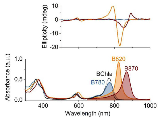 - Hartwich, G.; Scheer, H.; Aust, V.; Angerhofer, A. Absorption and ADMR studies on bacterial photosynthetic reaction centres with modified pigments. Biochim. Biophys. Acta 1995, 1230, 97–113. [Google Scholar] [CrossRef][Green Version]