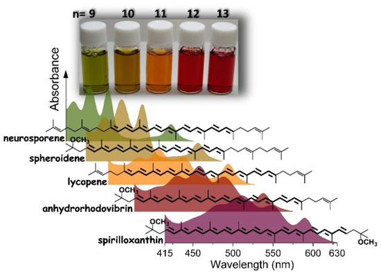- Polivka, T.; Frank, H. Light harvesting by carotenoids. Acc. Chem. Res. 2010, 43, 1125–1134. [Google Scholar] [CrossRef] [PubMed]