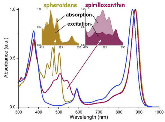 - Ashikhmin, A.; Makhneva, Z.; Bolshakov, M.; Moskalenko, A. Incorporation of spheroidene and spheroidenone into light-harvesting complexes from purple sulfur bacteria. J. Photochem. Photobio. B 2017, 170, 99–107. [Google Scholar] [CrossRef]