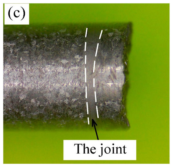 Scheme 7 is a case in which the joint is crushed during the upset stage, shown by cracking of the abutting end of a rod and flying away of the debris (Figure 2c). The difference between Scheme 7 and Scheme 6 is only the upset rate, which are 4 mm/s and 20 mm/s, respectively. This is attributed to the train rate sensitivity of this alloy. The upset stage is regarded as a forging process of the joint in which lower temperature parts of two rods take a part of the flat die. However, a lower strain rate is necessary to forge high-Nb containing TiAl alloys [20], so the upset rate in Scheme 7 was so high that the compressive strain rate exceeded the maximum allowable strain rate for forging the softening metals of joint, resulting in cracking. Scheme 8 adopted the largest Pf value in the study. In the early stage of friction, lesser heat was produced, and the abutting ends of the rods were in a brittle state. Because the resultant stress of Pf and tangential stress generated by friction exceeded the strength of the abutting ends, cracking occurred, and the welding process was stopped by the emergency stop (Figure 2d). From Schemes 7 and 8, it is concluded that thermal equilibrium should not be established under large frictional stress and a slower upset rate is necessary to avoid cracking.