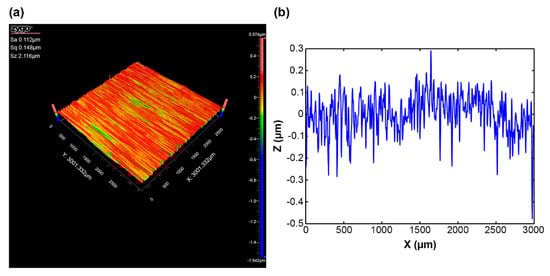 (a) Three-dimensional image of a 304 stainless-steel grinding surface at 0.122 μm. (b) Vertical section image of a 304 stainless-steel grinding surface at 0.122 μm.