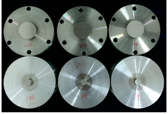 The experimental research took three different steel materials as the research objects: 45# steel, 40Cr steel, and 304 stainless steel. First, the specimens were machined to achieve the required size and shape. Common grinding wheels of various granularities (46#, 80#, and 120#) were selected to grind the specimen surfaces. Then, grinding surfaces with different levels of roughness were obtained. For each material, each of two specimens had the same roughness. Each sample was cleaned ultrasonically and dried. Owing to space limitations, we used 304 stainless steel as an example. Figure 4 shows a picture of 304 stainless-steel specimens.