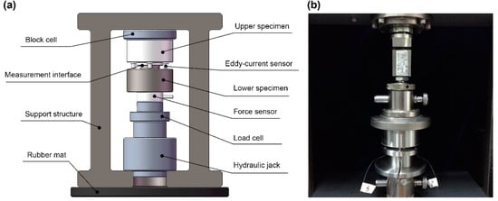 The whole test rig was vertically structured. All of the loading test units were connected in series in the support structure. A rubber mat was used for vibration isolation at the lower end of the support structure. The unit was loaded by a hydraulic jack with a target load of 6000 N. A KAP-TC pressure sensor (Kewill GmbH, Hamburg, Germany) was used to measure the contact load of the test surface. Three KD2306-1S eddy current displacement sensors (Kaman, Bloomfield, CT, USA) were installed on the upper specimens and uniformly arranged to measure the normal interference of the contact surface under contact load. The main parameters of experimental test are shown in Table 3.