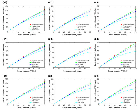 Within the range of contact pressure 10 MPa ≤≤ 70 MPa, under the same contact pressure, the values for contact stiffness of the present model were greater than for the CEB and KE models. With increasing contact pressure, the differences in contact stiffness among the three models increase gradually. At contact pressure 70 MPa, the contact stiffness reached its maximum in each of the three models, and the differences among the three models reached their maxima as well. At this point, the contact stiffness values were 103.71, 102.62, 83.02, and 97.73 MPa/μm for the experimental results, the present model, the CEB model, and the KE model, respectively. Similarly, an analysis was carried out in conjunction with Figure 2a. With increasing contact pressure, the contact of an asperity on the grinding surface undergoes a transition from the elastic deformation stage to the elastic–plastic deformation stage. The radius of curvature of the hemispherical asperity hence becomes smaller than under the cosine model, so the difference between the radii of curvature gradually increases. Therefore, under the same contact pressure, more asperities in the CEB and KE models will enter the plastic deformation stage, compared to the present model, resulting in the reduction of the contact stiffness values for those other models. In addition, the difference between the contact stiffness values gradually increases as the difference between the radii of curvature increases. The comparison results shown by other images in Figure 6 are similar to those in Figure 6a1, so they will not be repeated here.