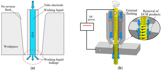 Schematic diagram of electrochemical reaming using a helical tube electrode together with lateral flushing: (a) after the electrical discharge machining (EDM) process; (b) electrochemical reaming as post-processing. ECM: electrochemical machining.