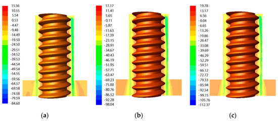 Figure 4 shows the contours of axial velocity in the machining gap at different lateral flushing pressures. It can be seen that the flushing pressure had an obvious influence on the velocity distribution in the machining gap during electrochemical reaming. With increasing flushing pressure from 1 MPa to 5 MPa, the electrolyte flow velocity increased significantly both inside and outside the helical groove. This implies that higher flushing pressures, in the range of 1–5 MPa, could further improve the flow of working fluid, thus effectively accelerating the removal of machining products.