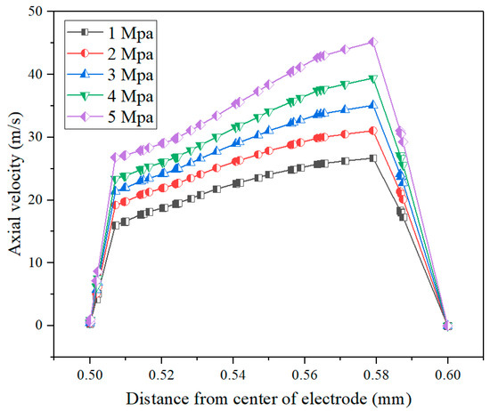 Axial velocity distribution of working fluid along sample lines at different flushing pressures.