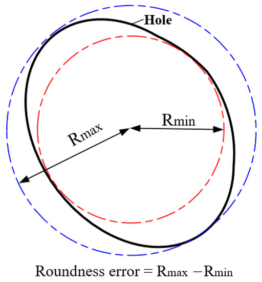 The geometric parameters of the hole were measured using a scanning electron microscope (Japan Electronics Co., Ltd., Tokyo, Japan) and optical microscope (Leica, Hesse, Germany). The roundness error was calculated using the minimum region method, as shown in Figure 7.