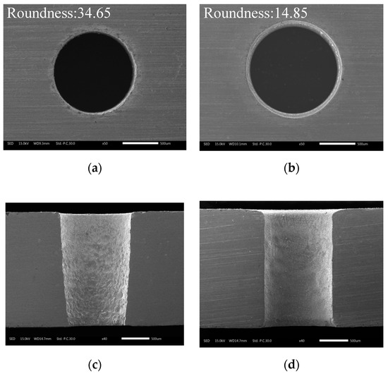 Figure 9 shows the exit morphology, taper, and side-wall morphology of holes machined with and without ECM post-processing. By comparing the exit morphology of the holes in Figure 9a,b, it can be seen that the exit diameter of the hole machined by EDM was significantly enlarged after post-processing with electrochemical reaming. Moreover, the edge of the exit machined by EDM was rough and irregular, and the roundness was 34.65 μm, whereas after ECM post-processing, the edge was smooth and regular, and the roundness was reduced to 14.85 μm. As shown in Figure 9c, with EDM alone, owing to the lack of working liquid in the machining gap at the exit, a hole with a large taper angle was obtained. However, the taper angle was clearly improved after ECM, as shown in Figure 9d. These results, together with Figure 8, indicate that electrochemical post-processing with external flushing was able to further machine and improve the exit obtained by EDM, thereby enhancing the accuracy of the hole.