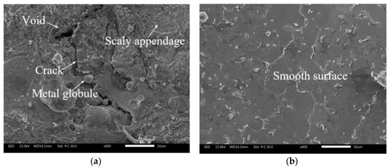 Figure 10 shows the surface morphology of the inner walls of holes machined by the different methods using a helical tube electrode. As can be seen from Figure 10a, the surface quality of the inner wall from EDM without ECM post-processing was extremely poor, with a large number of defects such as cracks, metal globules, and voids on the rough machined surface. In contrast, as shown in Figure 10b, the surface further processed by ECM with a helical tube electrode and external flushing was smooth, with a great reduction of the surface defects produced by EDM. There are two main reasons for the improvement in the surface quality of the hole wall. On the one hand, rapid lateral flushing of the electrolyte provided a clean and stable flow field for the whole electrochemical reaming stage, and continuous and sufficient electrochemical dissolution enabled effective removal of the surface defects caused by EDM. On the other hand, the rotating helical electrode greatly accelerated the removal of machining products, which further improved the rate of electrochemical reaction.