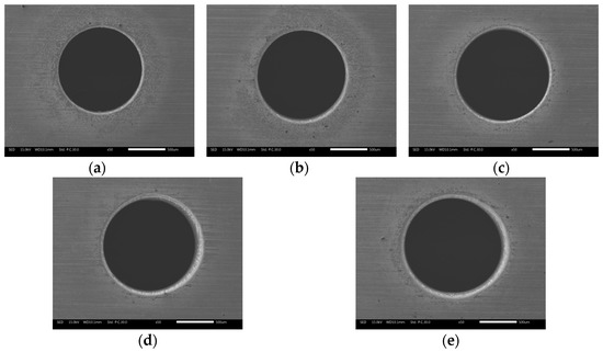 Exit morphology of holes after electrochemical reaming at different working fluid concentrations: (a) 2 g/L; (b) 4 g/L; (c) 6 g/L; (d) 8 g/L; (e) 10 g/L.