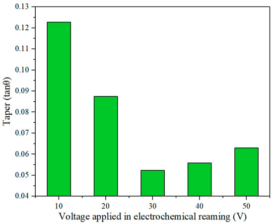 The principal indices for evaluating the accuracy of the holes were taper, circularity error, and diameter. A hole with the minimum taper was obtained at 30 V applied voltage, according to Figure 13, and this voltage also gave acceptable circularity error and exit aperture, as shown in Figure 11. Hence, an applied voltage of 30 V was concluded to be optimal for the accuracy of the machined hole.