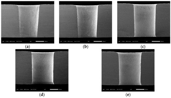 Figure 17 shows the variation of hole taper with electrolyte concentration. It can be seen that the taper first decreased and then increased with increasing concentration. Owing to the enhanced electrochemical reaction as the concentration increased, the exit was enlarged faster than the entrance, which reduced the taper. However, if the concentration was too high, products of electrochemical reaction accumulated at the exit, hindering uniform corrosion of the lateral wall of the hole and eventually resulting in an increased taper. This variation of the taper was consistent with the sectional views of the holes in Figure 18.