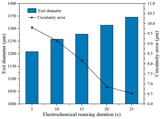 Figure 19 shows the variations of exit diameter and circularity error with the duration of electrochemical reaming. It can be seen that the exit diameter increased with increasing duration, while the circularity error of the exit gradually decreased. The increase in exit diameter is attributable mainly to the rapid enlargement of the lateral machining gap caused by electrochemical reaming. Simultaneously, the continuous electrochemical dissolution with increasing duration removed the defects at the exit machined by EDM and improved its circularity. Variations in the exit diameter and the circularity error with increasing duration of electrochemical reaming can also be identified in the exit morphologies shown in Figure 20.