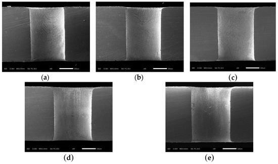 Sectional view of holes after electrochemical reaming at different applied voltages: (a) 10 V; (b) 20 V; (c) 30 V; (d) 40 V; (e) 50 V.