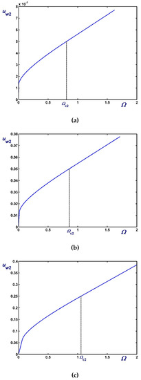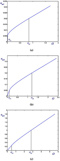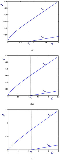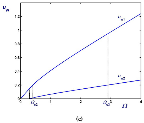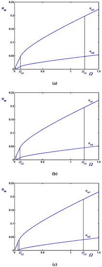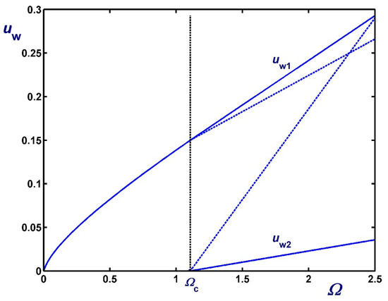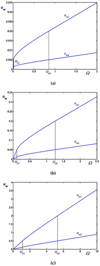 In the special case where , the two critical angular velocities and coincide. Indeed, substituting to Equations (65), (66), (81) and (82) yields