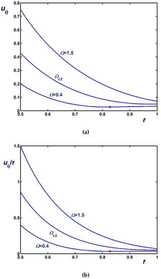 Since the derivation of the solution follows the same steps as in Section 2, it is omitted here and only the final dimensionless equations, with the same scales, are provided. It should be noted that in this general case and . The critical angular velocity is given by