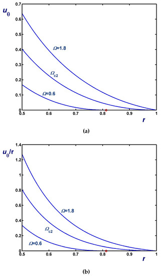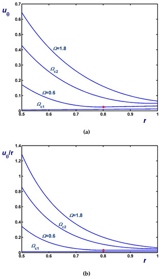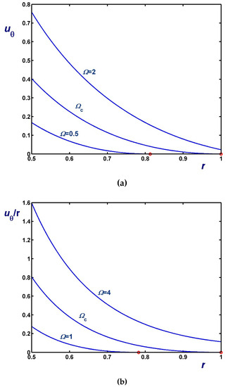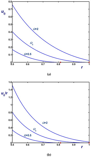 Four regimes are also encountered when (Figure 14b); the three critical values of the angular velocity defining these regimes now correspond to , , and . Hence, remains the same as above. In fact, the solution remains the same as that for in Regimes I, III, and IV; only the critical angular velocities and and the solution in Regime II are different. The first two critical angular velocities now read:
