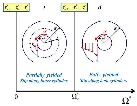 Two flow regimes are encountered in this case, which are illustrated in Figure 9. In Regime I, the material is partially yielded and slip is observed only at the inner wall. Hence, in the unyielded region the material is stagnant. In Regime II, the material is fully-yielded and slip occurs along both walls. The critical angular velocity defining the two regimes is the angular velocity at which .