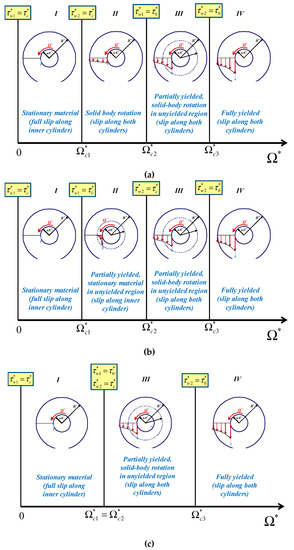 Since , it is possible to rotate the inner cylinder when while the material remains stationary, which simply implies that the material slips along the rotating cylinder. As illustrated in Figure 14, three different scenarios are possible, which correspond to the cases , , and discussed below.