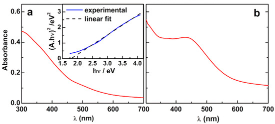 The spectrum of the mixed zinc/calcium ferrite nanoparticles in Figure 1a allows the determination of the optical band gap, using a Tauc plot (Equation (1)),