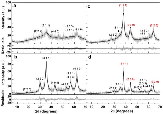 XRD diffractograms of zinc/calcium ferrite nanoparticles: (a) Non-calcined zinc/calcium ferrite; (b) calcined zinc/calcium ferrite; (c) non-calcined zinc/calcium ferrite decorated with silver; (d) calcined zinc/calcium ferrite decorated with silver. Gray lines: Experimental patterns; black lines: fitted patterns. Miller indices: Black: zinc/calcium ferrite; Red: Silver.