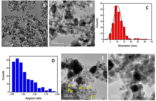 TEM images of the calcined zinc/calcium ferrite nanoparticles (Figure 3A,B) revealed generally rod-like or prismatic shapes, with a size distribution of 10 ± 3 nm (Figure 3C), obtained considering circles with the same area of each of the 206 particles that were manually delimited. Assuming instead a rectangular shape (ImageJ bonding rectangle), sizes of longer and shorter sides are, respectively, 12 ± 3 nm and 9.8 ± 3 nm, with a broad aspect ratio distribution between 1.04 and 2 (Figure 3D).