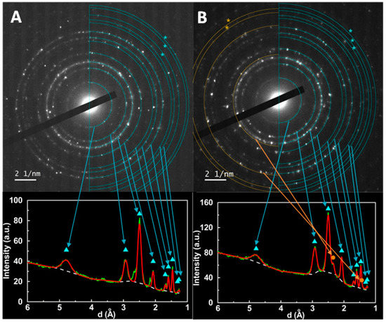 TEM SAED images of the synthesized zinc/calcium ferrite nanoparticles, without (A) and with silver (B). Below each image, a radial profile together with a fit is represented, considering the diffraction lines of zinc/calcium ferrite (marked by cyan triangles) and silver (marked by orange circles). Rings marked by asterisks pass by additional diffraction spots, but did not define a complete circle, not being possible to use in the radial profile.