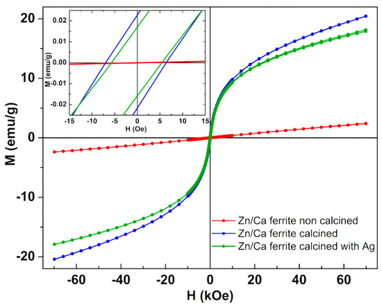 The magnetic properties of the prepared zinc/calcium ferrite nanoparticles, with and without silver coating (Figure 5) were characterized by measuring their magnetic hysteresis loop, which shows the relationship between the induced magnetic moment and the applied magnetic field (H). The calcined nanoparticles present a superparamagnetic behavior, as the ratio between remnant magnetization (Mr) and maximum magnetization (Ms) is below 0.1 (Table 4). If below 0.1, this ratio indicates that more than 90% of the magnetization is lost upon the removal of the applied magnetic field [31,32]. The very low maximum magnetization of the non-calcined nanoparticles is justified by their highly amorphous nature, as verified by XRD. With calcination, the maximum magnetization increases ten times (Figure 5), maintaining a low coercivity.