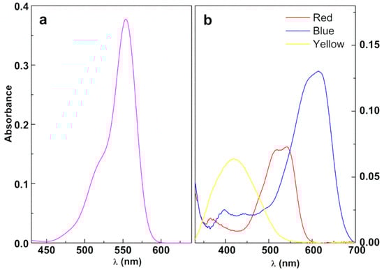 UV-Visible absorption spectra of aqueous solutions of (a) Rhodamine B (40 mg/L) and (b) industrial reactive dyes (80 mg/L). Red: C.I. Reactive Red 195; Blue: C.I. Reactive Blue 250; Yellow: C.I. Reactive Yellow 145.