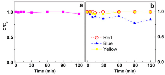 Photodegradation assays of solutions of (a) Rhodamine B (40 mg/L) and (b) industrial reactive dyes (80 mg/L) in the absence of magnetic nanoparticles. Red: C.I. Reactive Red 195; Blue: C.I. Reactive Blue 250; Yellow: C.I. Reactive Yellow 145.