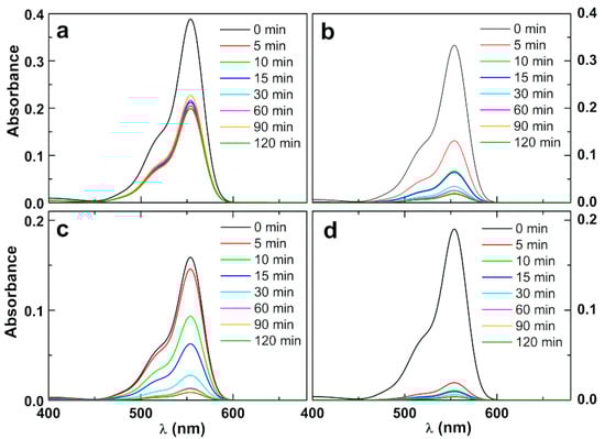 Photodegradation assays of solutions of the dye Rhodamine B (40 mg/L) by silver-decorated zinc/calcium ferrite nanoparticles (NPs), at various concentrations: absorption spectra of Rhodamine B solution at several irradiation times. (a) 2 mg/mL of Ag-coated calcined NPs; (b) 2 mg/mL of Ag-coated non-calcined NPs; (c) 3 mg/mL of Ag-coated calcined NPs; (d) 4 mg/mL of Ag-coated calcined NPs.