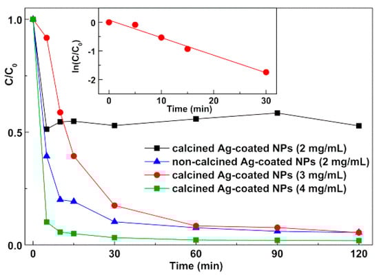 A pseudo-first-order kinetics is only verified for the first 30 min in the case of Ag-decorated nanoparticles 3 mg/mL (inset of Figure 9), corresponding to a rate constant of 0.0614 min−1 (R2 = 0.983). In the other cases, the degradation rate is very low (calcined NPs 2 mg/mL) or too fast (non-calcined NPs and calcined NPs 4 mg/mL). This rate compares well with the one obtained for Rhodamine B photodegradation with visible light using g-C3N4 (k = 0.065 min−1) [14] and much higher than the one recently reported in assays with an Ag2S-ZnS nanozised catalyst loaded on cellulose (k = 6.4 × 10−3 min−1) [37].