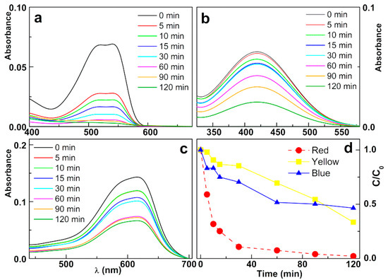 Photodegradation assays of solutions of the textile reactive dyes (80 mg/L) by silver-decorated zinc/calcium ferrite nanoparticles (2 mg/mL): absorption spectra of textile dyes solutions at several irradiation times. (a) Red; (b) Yellow (c) Blue; (d) Degradation curves. Red: C.I. Reactive Red 195; Blue: C.I. Reactive Blue 250; Yellow: C.I. Reactive Yellow 145.