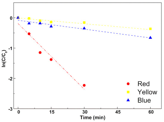 Plot of the pseudo-first-order kinetics for degradation of textile dyes. Red: C.I. Reactive Red 195; Blue: C.I. Reactive Blue 250; Yellow: C.I. Reactive Yellow 145.