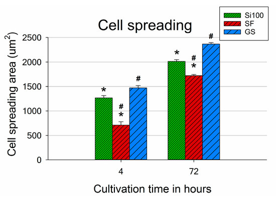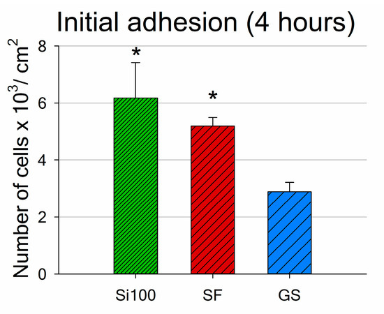Both the SF samples and the Si(100) reference samples supported quick initial adhesion of MG-63 cells. The number of adhered cells 4 h after seeding was around twice as high on both materials than the number of cells found on the control microscopic glass coverslips (GS; Figure 5).