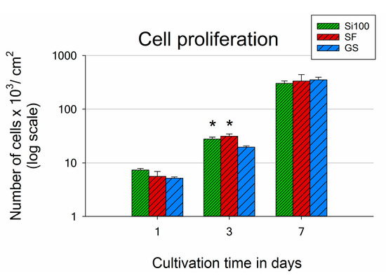 The numbers of cells adhered to the materials after 1 day of cultivation showed the same tendency as the numbers of initially adhered cells (4 h after seeding; Figure 5 and Figure 7). However, the differences were not proven to be significant, due to the high data spread. Only on day 3 after seeding did the results reveal markedly higher cell population densities on SF and Si(100) than on GS (with values of 31,200 cells per cm2 on SF; 27,800 cells per cm2 on Si(100) and 19,600 cells per cm2 on GS; Figure 7).