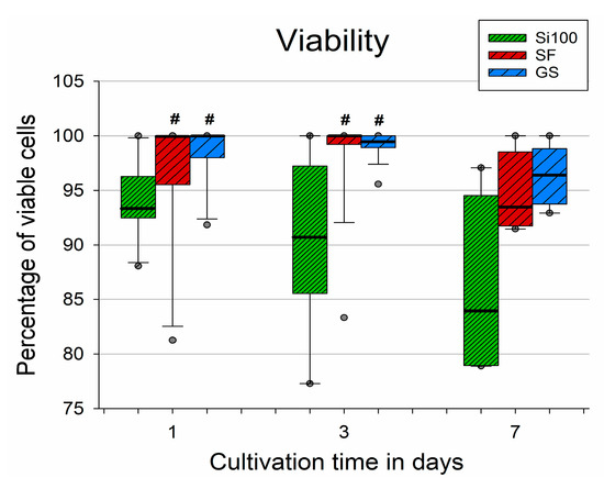 Viability of MG-63 cells cultivated for 1, 3, and 7 days on an unmodified Si(100) wafer, on an Si(100) wafer coated with a silicalite-1 film (SF), and on a microscopic glass coverslip (GS). Data expressed as a percentage of viable cells per sample. The box plot black bold central line shows the median. Its upper and lower edges represent the 1st and the 3rd quartile (Q1 is the 25th percentile, Q3 is the 75th percentile of the sample), whiskers depict the maximum and minimum values, dark grey dots show the outliers (5th and 95th percentile of the sample). Kruskal–Wallis one-way ANOVA on Ranks, Dunn’s test; statistical significance (p ≤ 0.05): # compared to Si(100).