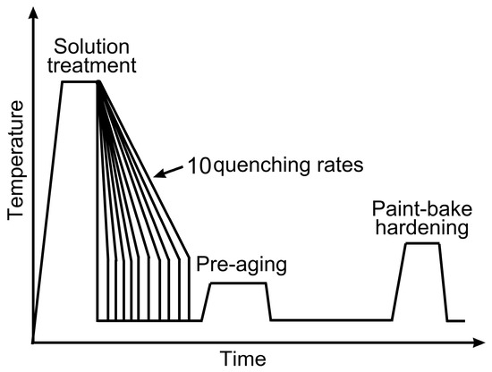 The as-quenched sheets were immediately pre-aged at 80 °C for 5 h. Subsequently, all sheets were subjected to paint bake-hardening at 185 °C after storage at RT for 168 h. One set of the as-quenched sheets was isothermally heated at 400 °C for 2 h as a control. A schematic representation of the heat treatment procedure is presented in Figure 1, and the measured cooling curves for the as-prepared sheets are presented in Figure 2.
