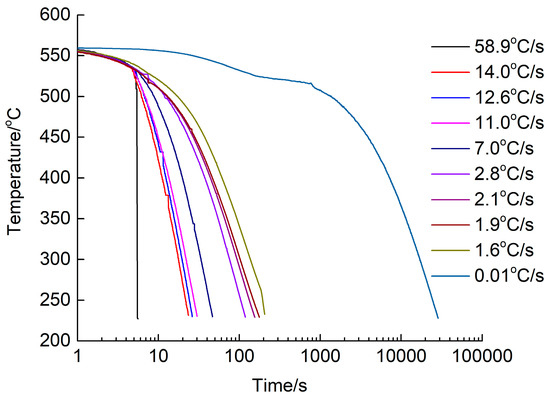 Ten cooling curves of different quenching rates from 58.9 °C/s to 0.01 °C/s.
