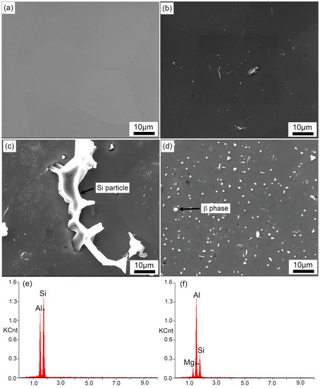 Figure 4 shows SEM micrographs of the particles distributed in the matrix. We found that the size and density of particles increased with decreasing quenching rates. A closer look at the micron particles indicated that these particles were square, spherical, or rod-shaped. According to our EDS analysis (Figure 4f,g), the coarse irregular particles larger than 20 μm were Si phase, while some square particles were β phase (arrows in Figure 4). Thus, we found that an equilibrium β phase was obtained by the annealing treatment method we had adopted here.