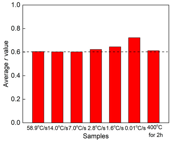 where , , and are the r values in three different directions [21]. Figure 7 shows the average r value of samples with the T4P state (a state of being placed at RT after pre-aging). After pre-aging at 80 °C for 5 h, the average r values of samples with different quenching rates were all higher than 0.6, which suggested that a good deep drawability had developed through these treatments. The r value remained a constant value of ~0.6 with a quenching rate higher than 7.0 °C/s and heat treatment at 400 °C for 2 h, and this value increased with decreasing quenching rate. The r value eventually reached a value of ~0.7 when the quenching rate was dropped to 0.01 °C/s.